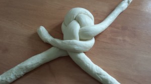 Backblech mit Backpapier versehen, die Zöpfe darauf legen und diese nochmals mit einem feuchtem Küchentuch zugedeckt für ca. 45 Minuten aufgehen lassen.