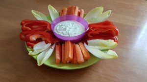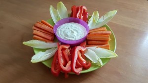 Das verschiedene Gemüse in etwa Zeigfinger lange Stängelchen schneiden und auf einem grossen Teller rundum mit den Gemüsestängelchen belegen. .