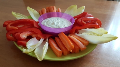 Nun die Gemüsestängelchen mit den Fingern in den Quark tauchen und abbeissen.