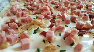 Die abgekühlten Zwiebeln und die Schinkenwürfeli ebenfalls gleichmässig darauf verteilen.