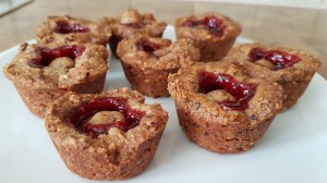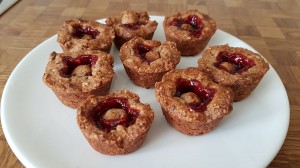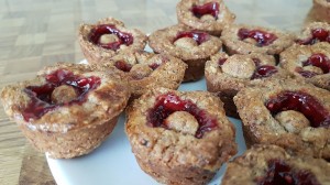 Mit dem restlichen Teig von Hand kleine Kugeln formen und jeweils eine Kugel  wie ein kleiner Deckel auf die  Himmbeerkonfitüre legen.