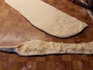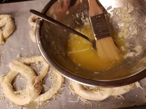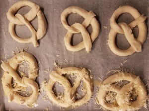 Teig halbieren und die Hälfte des Teiges rechtechig dünn auswailen, Der Länge nach in mehrere ca.2 cm. lange Streifen schneiden. Mit geriebenem Käse füllen und den Teig zusammen klappen. Aus den mit Käse gefüllten Teigstreifen Brezel formen und auf ein mit Backpappier belegtes Blech legen.  Das gleiche auch mit der zweiten Teighälfe machen.