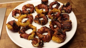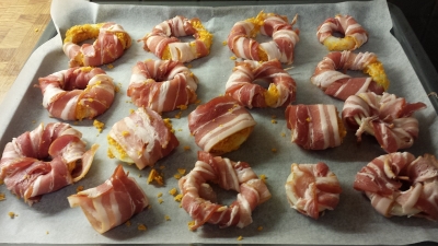 Mit 1-2 Tranchen Speck umwickeln und auf ein mit Backpapier ausgelegtes Blech legen.